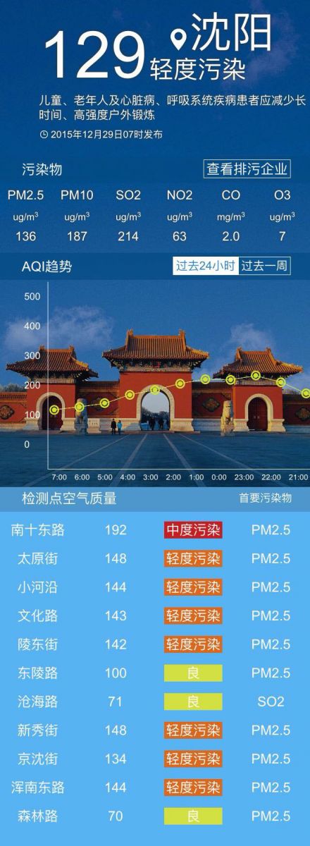 今天是2015年12月29日,星期二。和前兩天相比,沈城的天氣少了一些凜冽的寒冷。但是,從昨天開始就和咱大沈陽糾纏不休的霾天氣依然沒有消散,大家出門前還是要注意防護。