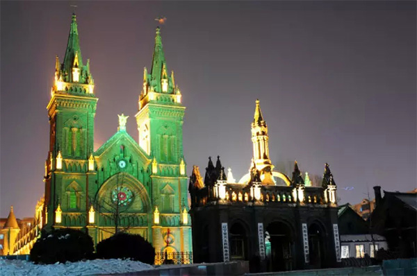 沈陽小南教堂也在夜晚中盡顯異域風情。