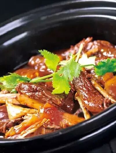 3、鍋上火,放入提前壓好的牛肉、牛板筋和牛蹄筋,倒入壓牛肉的原湯500克,大火燒熱,裝入煲仔爐內(nèi),點(diǎn)綴香菜梗,加熱上桌即可。