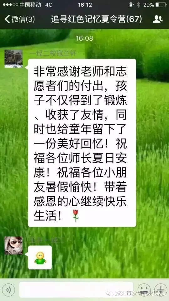 兩天的活動(dòng)在少年宮老師細(xì)心周到地安排下,孩子們過(guò)得既充實(shí)又開心。滿洲省委舊址里認(rèn)真地聆聽講解、樹蔭下聽老英雄追憶往事,沈陽(yáng)市團(tuán)校內(nèi)揮汗如雨的歷奇訓(xùn)練、夜晚多功能廳內(nèi)興高采烈地聯(lián)歡、荷花池旁的駐足、科技館里探索科學(xué)世界的秘密……這一幕幕都深深地刻在了孩子們的腦海里,洪亮的口號(hào)是孩子們堅(jiān)定的信念,張張笑臉是活動(dòng)過(guò)程中成功的印記。白天孩子們共同享受團(tuán)隊(duì)生活的快樂(lè),夜晚躺在床鋪上一起述說(shuō)童年的趣事。閉營(yíng)儀式上,同學(xué)們相擁而泣,短暫的兩天讓大家結(jié)下了深厚的友誼。
