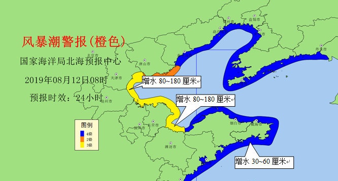 自然資源部北海預報中心官方微博發(fā)布風暴潮預警,受今年第9號臺風"利奇馬"(熱帶風暴級別)影響,預計8月12日上午到13日上午,山東半島沿岸將出現(xiàn)30-60cm的風暴增水,萊州灣和渤海灣沿岸將出現(xiàn)80-180cm的風暴增水。曹妃甸和京唐港驗潮站將出現(xiàn)達到當?shù)爻壬涑蔽坏母叱蔽?。濰坊港、黃河海港、濱州港、黃驊和塘沽驗潮站將出現(xiàn)達到當?shù)攸S色警戒潮位的高潮位,蓬萊、龍口和秦皇島驗潮站將出現(xiàn)達到當?shù)厮{色警戒潮位的高潮位。河北省唐山市預警級別為橙色,山東省濰坊市、東營市和濱州市,河北省滄州市和天津市預警級別為黃色,山東省日照市、青島市、威海市和煙臺市,河北秦皇島市預警級別為藍色。