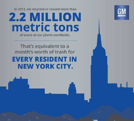 2013年,通用汽車的全球工廠回收再利用的廢棄物材料總量超過220萬噸。這些廢棄物能裝滿3800萬個完整的垃圾袋,而且它相當于每個紐約居民在一個月產(chǎn)出的垃圾總和。
