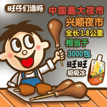 除了愛運(yùn)動(dòng),旺仔君的另一個(gè)愛好就是美食。想知道中國最大的夜市在哪個(gè)城市嗎?答案是沈陽市鐵西區(qū)興順街的興順夜市,北起建設(shè)大路,南至沈陽工業(yè)大學(xué),全長約1.8公里,一期共設(shè)有攤位594個(gè)。興順夜市的營業(yè)時(shí)間是17時(shí)30分至23時(shí)。它的長度相當(dāng)于3000包旺旺吸吸冰。旺粉有去過哪些美食街?最喜歡的美食是?