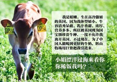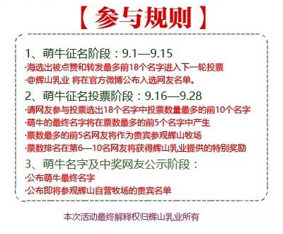 輝山乳業(yè)牧場已經(jīng)擁有超過18萬頭進口奶牛,其中有只特別的娟姍小牛要降生了,但牛寶寶還沒!有!名!字!誰愿意幫它?輝山乳業(yè)在最霸氣、最創(chuàng)意的名字中進行海選投票,如被選中就有機會參觀輝山牧場并與萌牛寶寶見面哦!