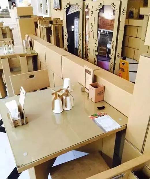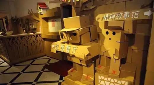 紙箱王的創(chuàng)意都是為了環(huán)??紤],餐廳里所有的擺件都可以再回收利用。
