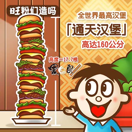 全世界目前最高的"通天漢堡"由某英國(guó)漢堡店老板制成!高160公分、比旺仔還高呢!這個(gè)漢堡排了10個(gè)芝士漢堡,每個(gè)都夾熏肉、肉醬、意大利面、香腸、肉丸、牛肉、色拉。高度嚇人,熱量更嚇人,高達(dá)3萬卡路里!