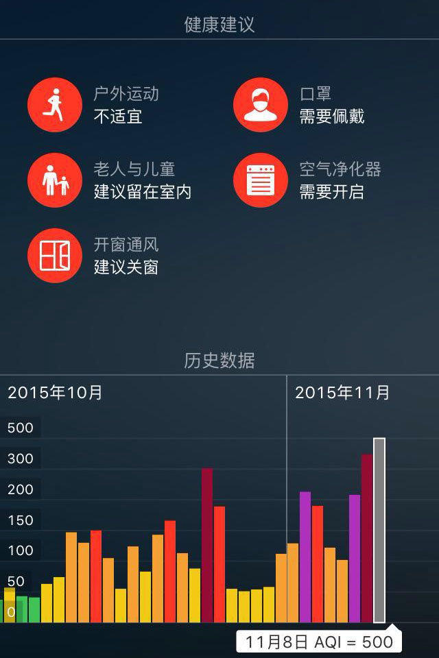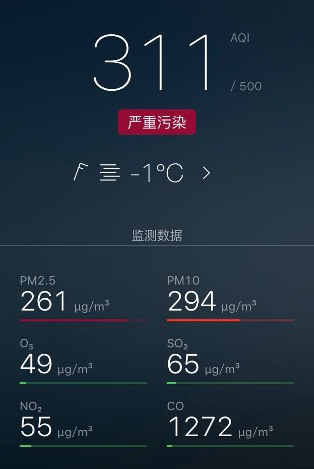 今日(周一)的空氣質(zhì)量相對(duì)周日有所好轉(zhuǎn),但依然是處于嚴(yán)重污染的狀態(tài),近期外出,口罩成了必備品,老人和兒童留在室內(nèi)是"安全"的選擇。建議室內(nèi)養(yǎng)殖一些綠色植物,在不宜開(kāi)窗換氣的天氣中,綠色植物可以改善室內(nèi)空氣質(zhì)量。
