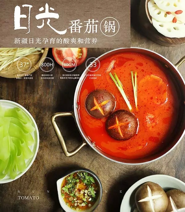 每一鍋湯汁均由33顆新鮮飽滿的新疆番茄經過溫火慢燉而成,番茄的果實全都化為湯里的精華。