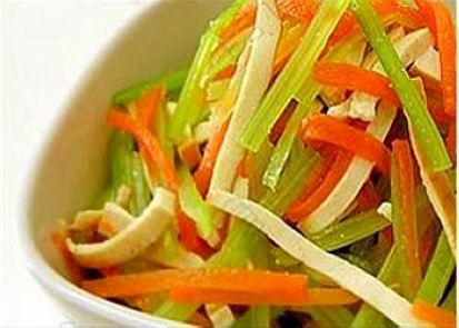 2、鍋中水煮開(kāi)后,放入芹菜段,再煮滾后放入豆腐皮和胡蘿卜絲,見(jiàn)芹菜稍一變色即可撈出;