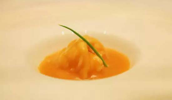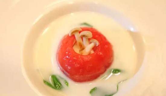 鮮魚(yú)汁十月紅 38元/位:意為"花好月圓",有著"金枝玉葉"美稱(chēng)的白玉菇加上甜豆、面片、豆苗放入番茄中,番茄浸入魚(yú)湯,象征洞房春暖魚(yú)水情深。