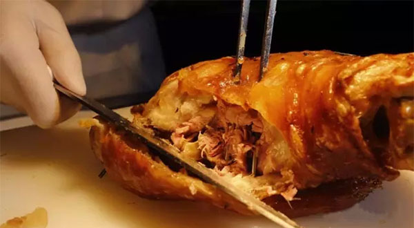 德國(guó)咸豬肘,選用肉質(zhì)鮮嫩的豬前肘,浸泡于月桂葉、杜松漿果調(diào)制的鹽水中至少24小時(shí)。次日,先以大火蒸、再用秘制調(diào)料刷,最后再經(jīng)過180度和220度的兩輪烤制,方可上桌兒。這樣的做法,讓豬皮充分膨脹、入口酥脆,外焦里嫩到了骨子里。