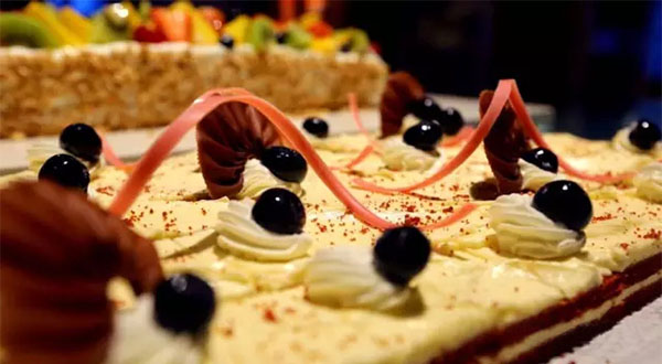 晚餐時(shí),可以自取的甜品多達(dá)30多種,均是由糖立方實(shí)時(shí)供應(yīng)。紅絲絨、芝士蛋糕……香甜絲滑,松軟適中,且不甜膩。食材全部采用國(guó)外進(jìn)口,用料精確到克,品質(zhì)得到了極高的保證。