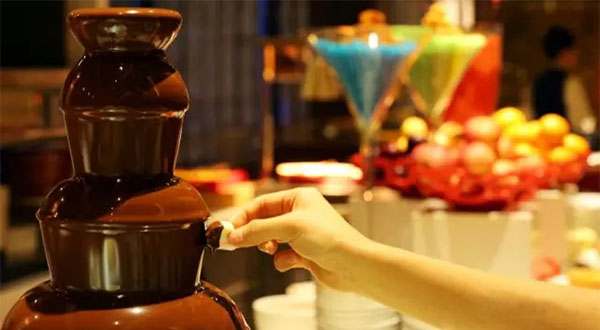 每逢海鮮之夜,都會(huì)備上孩子們的味蕾統(tǒng)領(lǐng)——巧克力噴泉。醇厚的德國(guó)巧克力柔滑香甜,在棉花糖表面裹上一層,滿是甜蜜的幸福感。